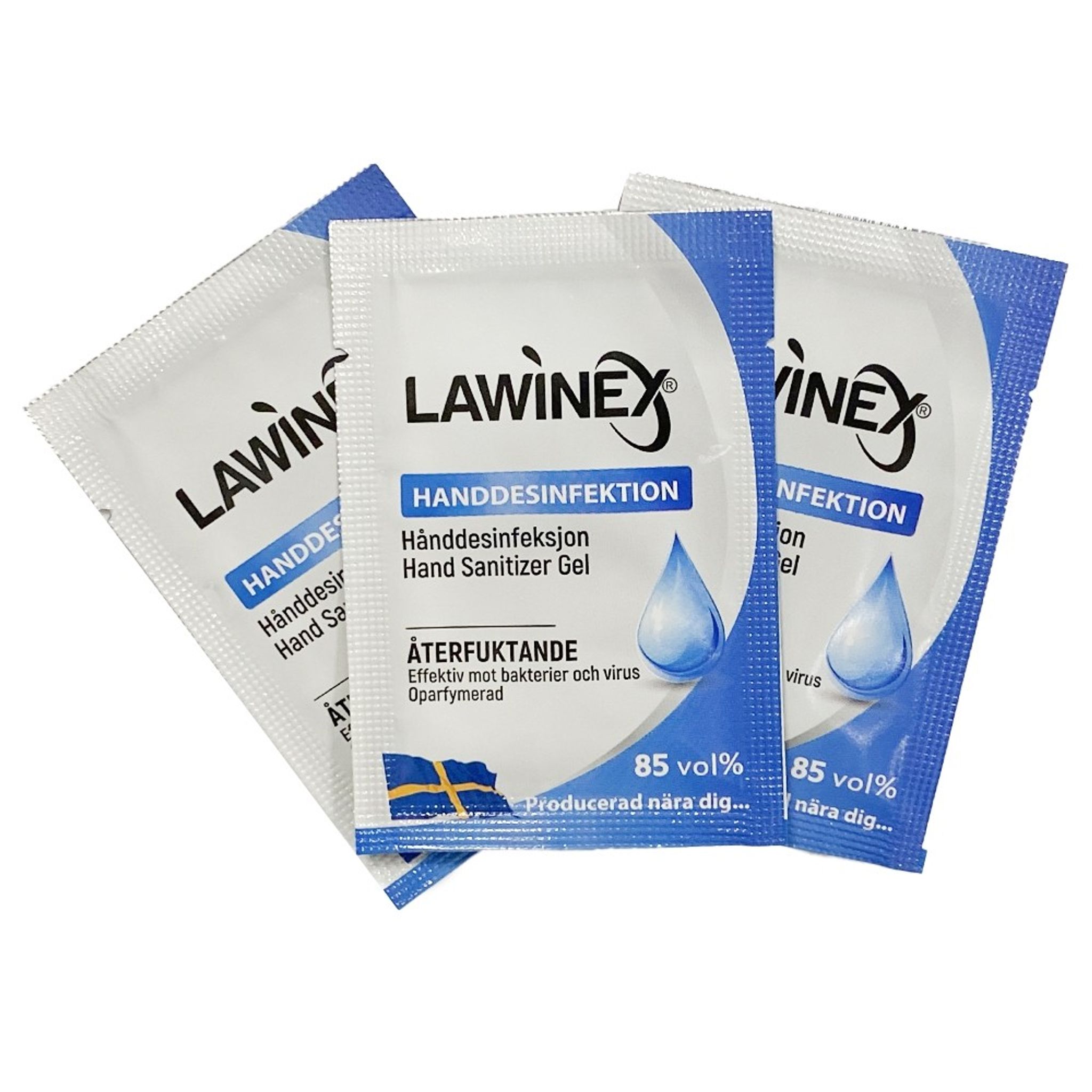 Handdesinfektion gel återfuktar dina händer och är effektiv mot virus och bakterier. Innehållet från en förpackning gnids in på torra händer under 30 sekunder. Sorteras som pappersförpackning och innehållet som brännbart hushållsavfall. Sista användningsdatum står skrivet på förpackningen. Pris på förfrågan.